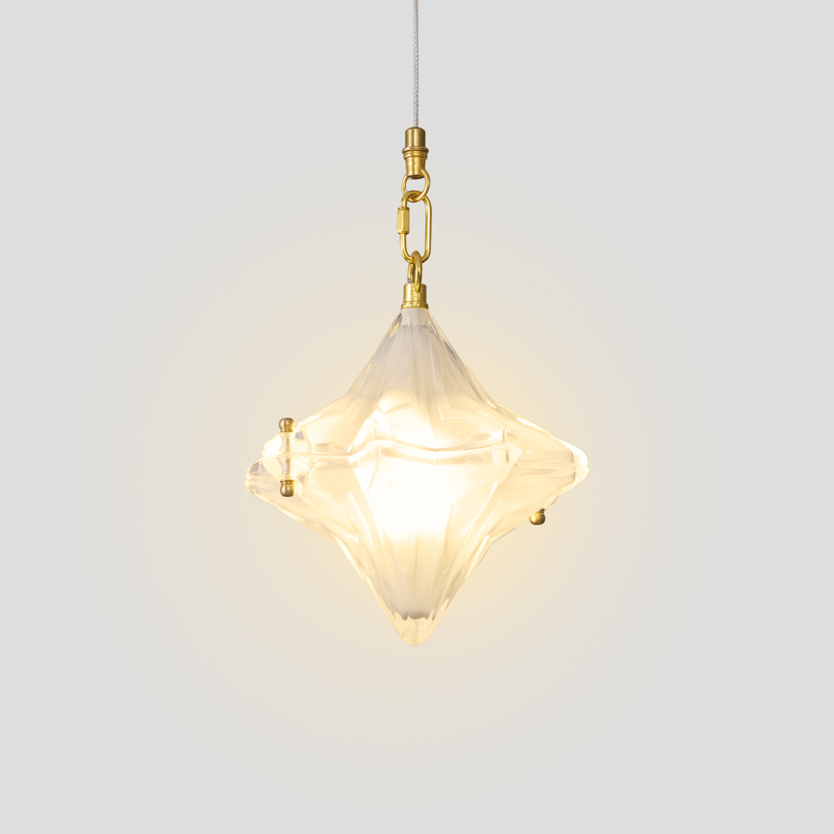 This elegant copper-colored pendant light features a unique design crafted from white wax wood, aluminum parts, durable hardware, and hand-blown glass that resembles faceted crystal. It emits a soft, warm LED light (E14 base, 5W per bulb) to create a cozy ambiance in any space. With a compact yet striking design, this light is perfect for adding a touch of charm to bedrooms, dining rooms, bar counters, and other decorative areas.