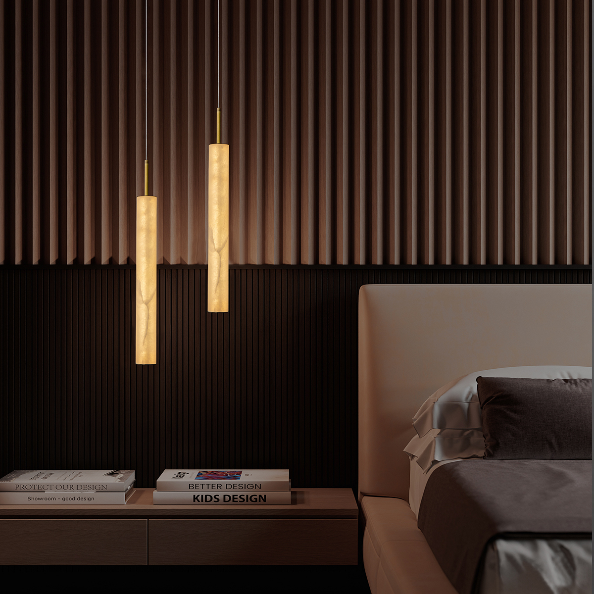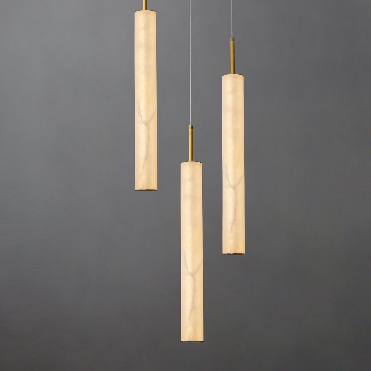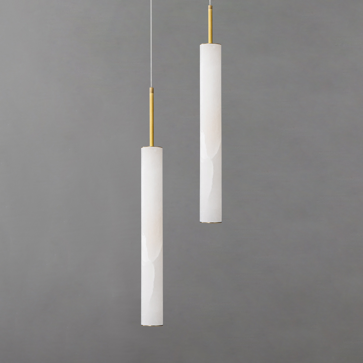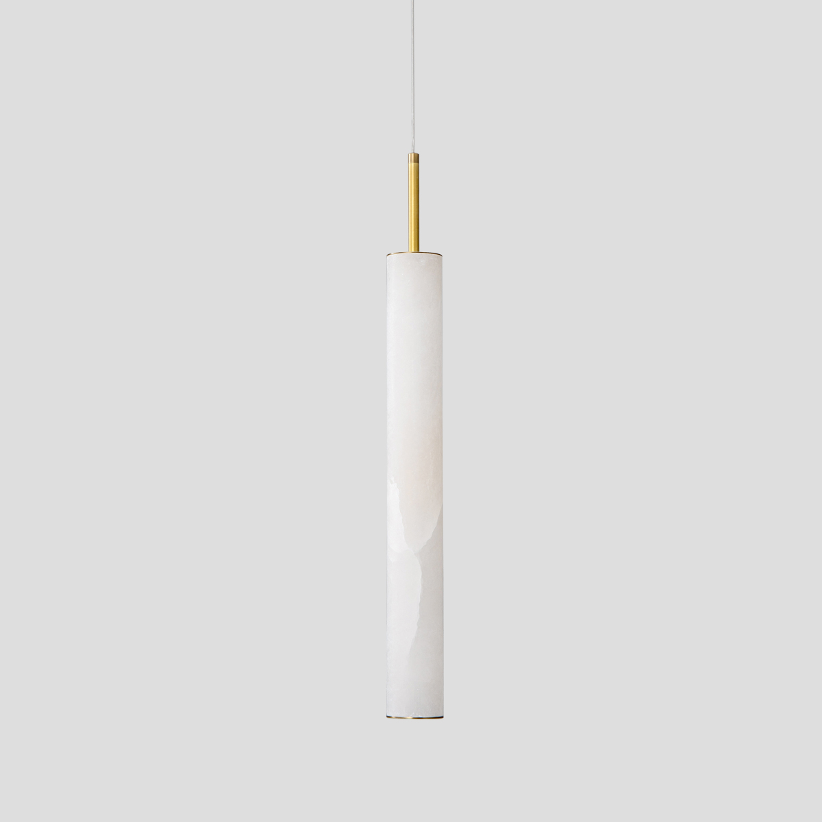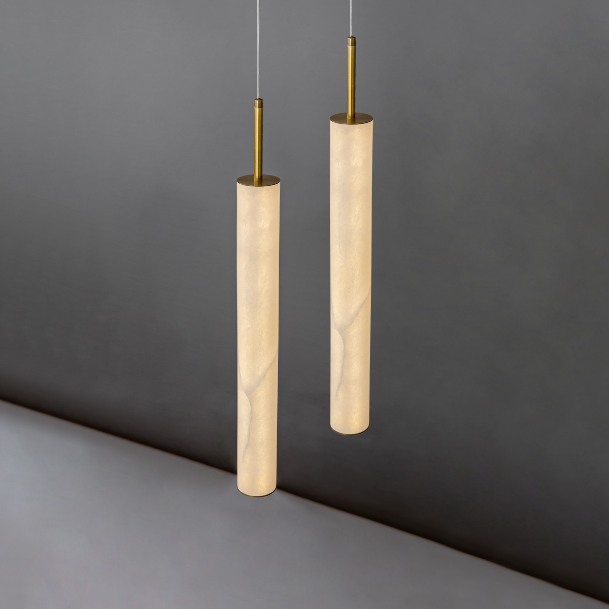 This pendant light is made from high-quality copper for the base and natural marble for the cylindrical shade. The combination creates an elegant, modern look with natural texture.